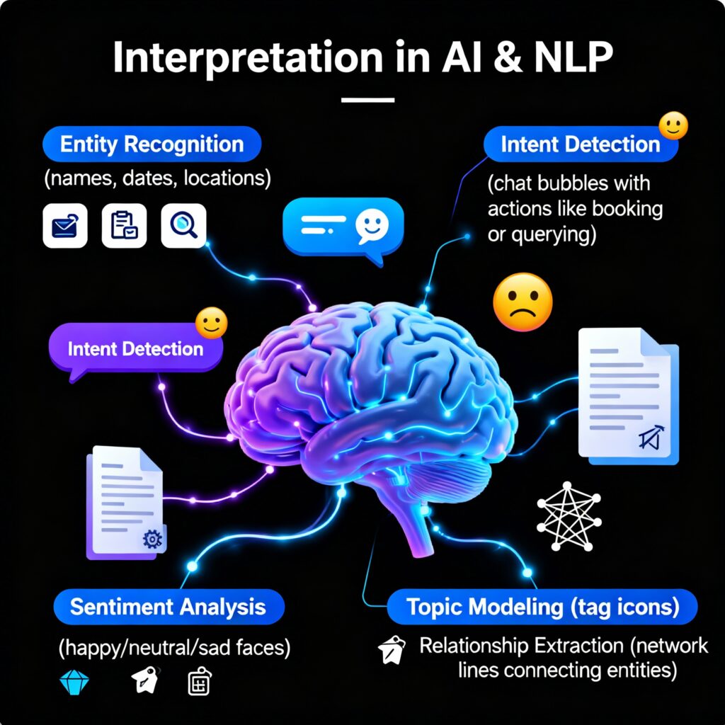 Interpretation in AI focuses on extracting meaning, context, and intent from raw data, enabling machines to understand human input. In NLP and Document AI, it involves tasks like entity recognition (identifying names, dates, locations), intent detection, and sentiment analysis. It also includes topic modeling to classify text, relationship extraction to link entities, and contextual understanding to interpret word meanings accurately based on sentence or document context.