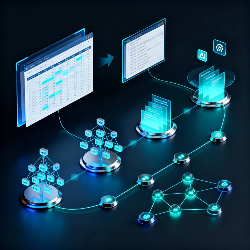 Once data is interpreted, structuring organizes it into formats usable by AI systems and databases, such as rows, columns, and fields. Common methods include tabular formats (CSV, Excel, SQL) for structured data, and JSON or XML for hierarchical relationships like form fields. Knowledge graphs connect entities through semantic links, while labeled training data transforms text into annotated tokens, supporting tasks like Named Entity Recognition (NER) and other NLP applications.