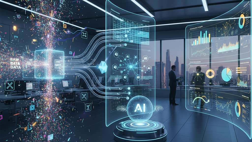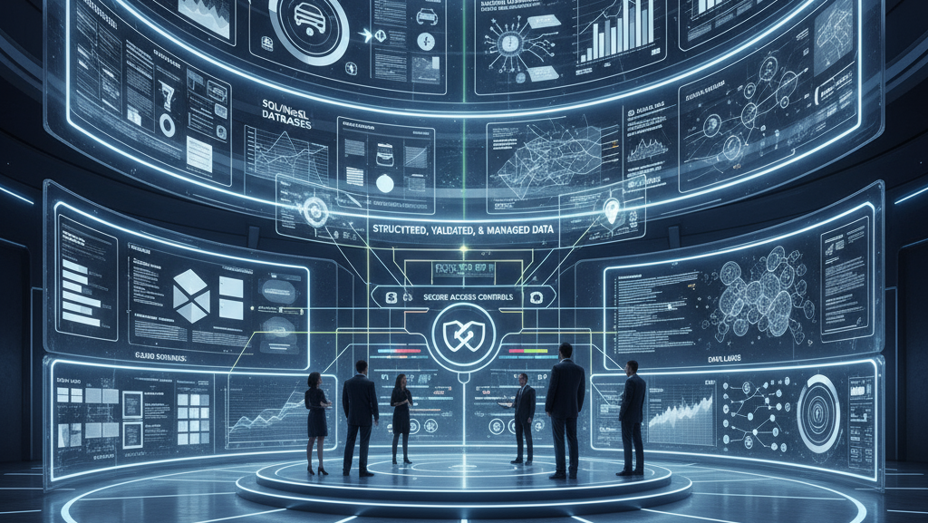 A futuristic data management scene showing processed data being stored in SQL/NoSQL databases, cloud storage, and data lakes with secure access controls and backups. Visualize dashboards, machine learning models, and real-time applications using the data. Include graphs, charts, AI icons, and glowing connections to convey actionable insights and business intelligence emerging from structured, validated, and managed data.