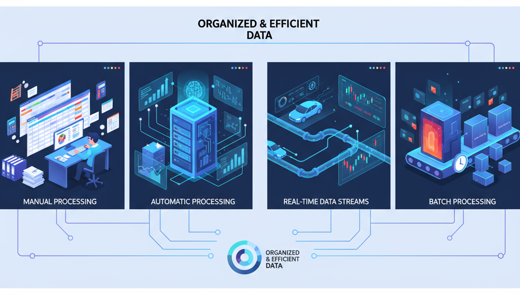 Data processing can be categorized into several types. Manual data processing involves human effort to clean, organize, or input data, such as updating spreadsheets, and is suitable for small-scale tasks despite being time-consuming and error-prone. Automatic (electronic) data processing uses computers, algorithms, and pipelines to handle large datasets, enable real-time analytics, and support AI model training. Real-time processing handles data instantly, crucial for applications like self-driving cars, financial trading, and fraud detection. Batch processing manages large data volumes at once, commonly used in data warehousing, billing, and research.