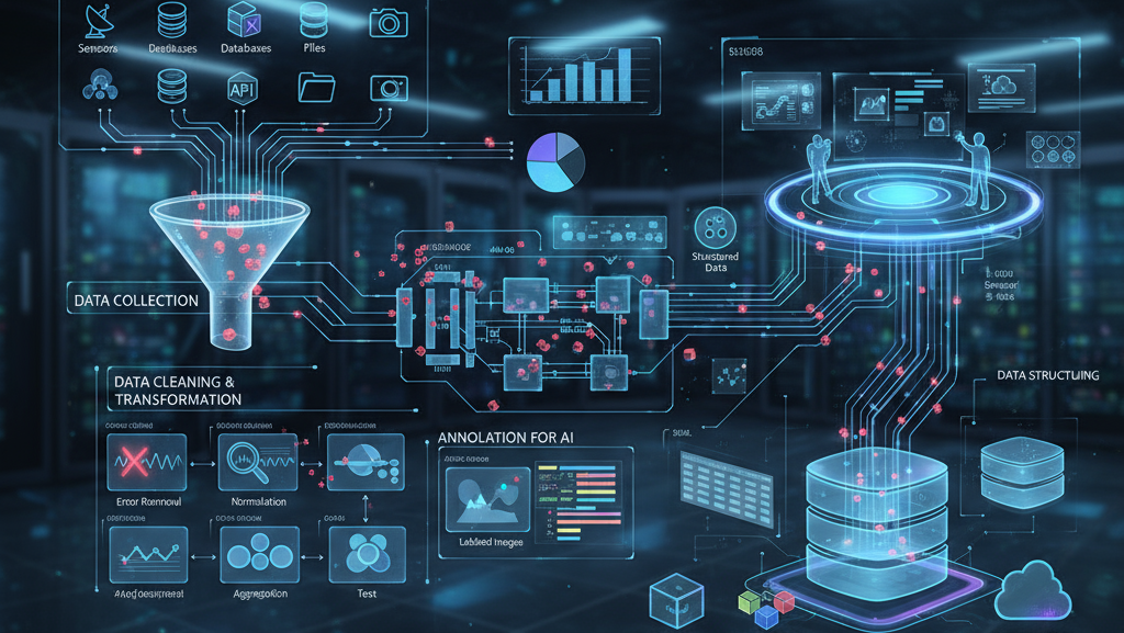 Data processing begins with data collection from sources like sensors, databases, APIs, files, cameras, or user inputs, which may be structured, semi-structured, or unstructured. The data is then cleaned to remove errors, duplicates, and inconsistencies, and transformed through normalization, encoding, or aggregation. For AI applications, data annotation labels the data, while structuring organizes it into databases or tables for easy retrieval and analysis, followed by validation to ensure quality and accuracy.