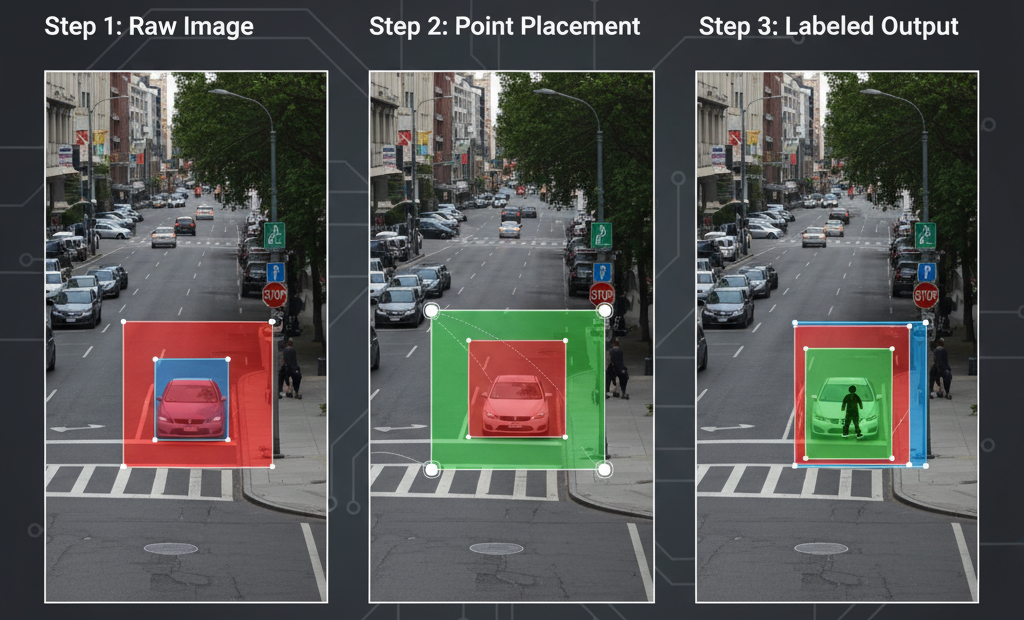 Class Labeling: Each box is assigned a category label (e.g., “car,” “pedestrian,” “dog”) so the model knows what the object represents.