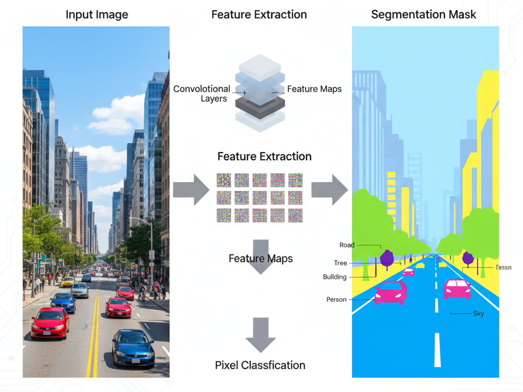 Data Preparation: The process begins with annotated datasets where every pixel is labeled with its class (e.g., sky, car, road).