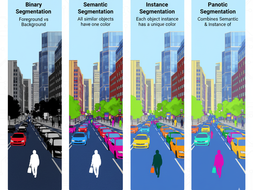 - Simplest form — classifies pixels into two categories (e.g., foreground vs background).